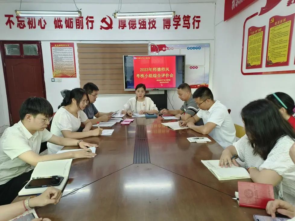 会议上,考核工作组组长、党支部书记郭振芳作动员讲话,介绍了本次会议精神和会议议程,并向与会成员展示了2022-2023年师德师风专项考核实施情况与考核结果。本次考核工作由学校党支部牵头,分组对全体在职教职工实施考核,考核从爱国守法、意识形态、爱岗敬业、关爱学生、为人师表等方面综合测评,分个人自评、基层测评、审核公示、申诉或举报、审核批准、备案存档等环节。现阶段各教研小组已经完成了个人自评、基层测评并上报考核结果。随后,参会人员对考核结果审议并民主表决通过。考核小组认为加强教师职业道德教育是师德师风建设的基础,要不断完善考核机制,对不合格教师进行处罚。