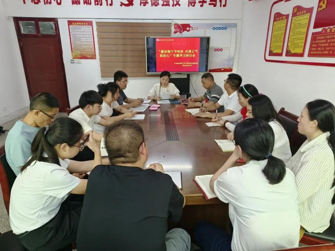 在端午节来临之际,为增强党风廉政和反腐败宣传教育,严格党的组织生活,增强党组织的凝聚力、战斗力,充分发挥党员的先锋模范作用,6月21日,新余新兴产业工程学校党支部开展“廉洁端午节味浓 风清正气践初心”专题学习研讨会。党支部书记郭振芳主持会议,全体党员教师参会。