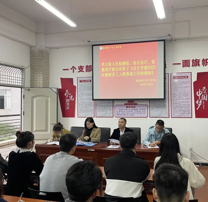 4月25日,新余新兴产业工程学校组织教职工学习了省人民检察院、省公安厅、省教育厅联合印发的《关于开展2023年教职员工入职查询工作的通知》文件。