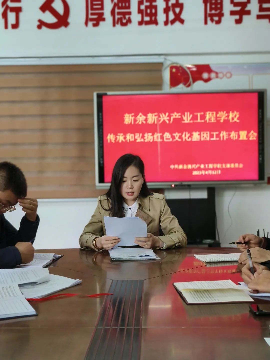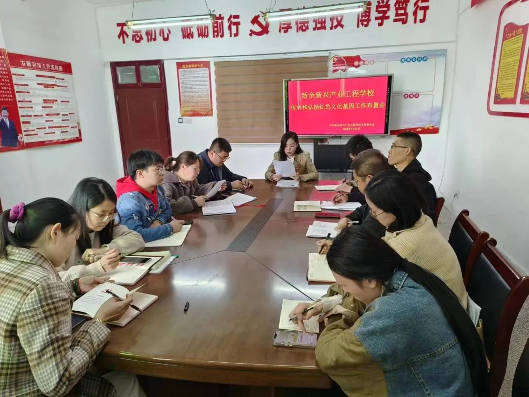 为深入学习贯彻党的二十大精神,大力培育和践行社会主义核心价值观,激励广大党员传承红色基因,坚定理想信念。新余新兴产业工程学校开展传承和弘扬红色文化基因工作布置会。会议由党支部书记郭振芳主持,全体党员教师参加。
