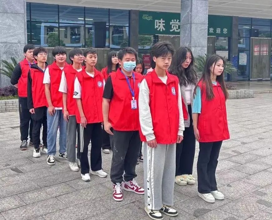 这一天,志愿者们整队出发,巡视校园,身披红色马甲的他们成为了校园里一道亮丽的风景.