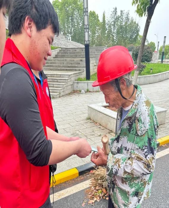 志愿者看到扫地的大爷忙碌着工作,在扫地扬起的灰尘不时地咳嗽,志愿者马上将口罩分发给清洁工人们。他们也是学校里的一员,同学们十分感谢他们为建设清洁校园作出了巨大的贡献。