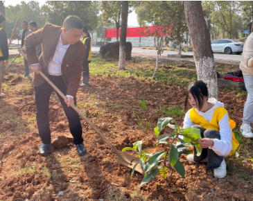 学校党支部书记郭振芳、校长李一龙、党支部副书记刘鹏龙、学工副校长孙刚、教务副校长袁英、办公室主任朱晓刚、团委书记兰芙蓉、学工处主任陈晨与青年志愿者队伍一起前往学校绿植区进行植树活动。