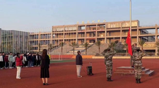 伴随着雄壮的《义勇军进行曲》,鲜艳的五星红旗冉冉升起。全体师生们集体向国旗行注目礼,整个过程庄严而肃穆。