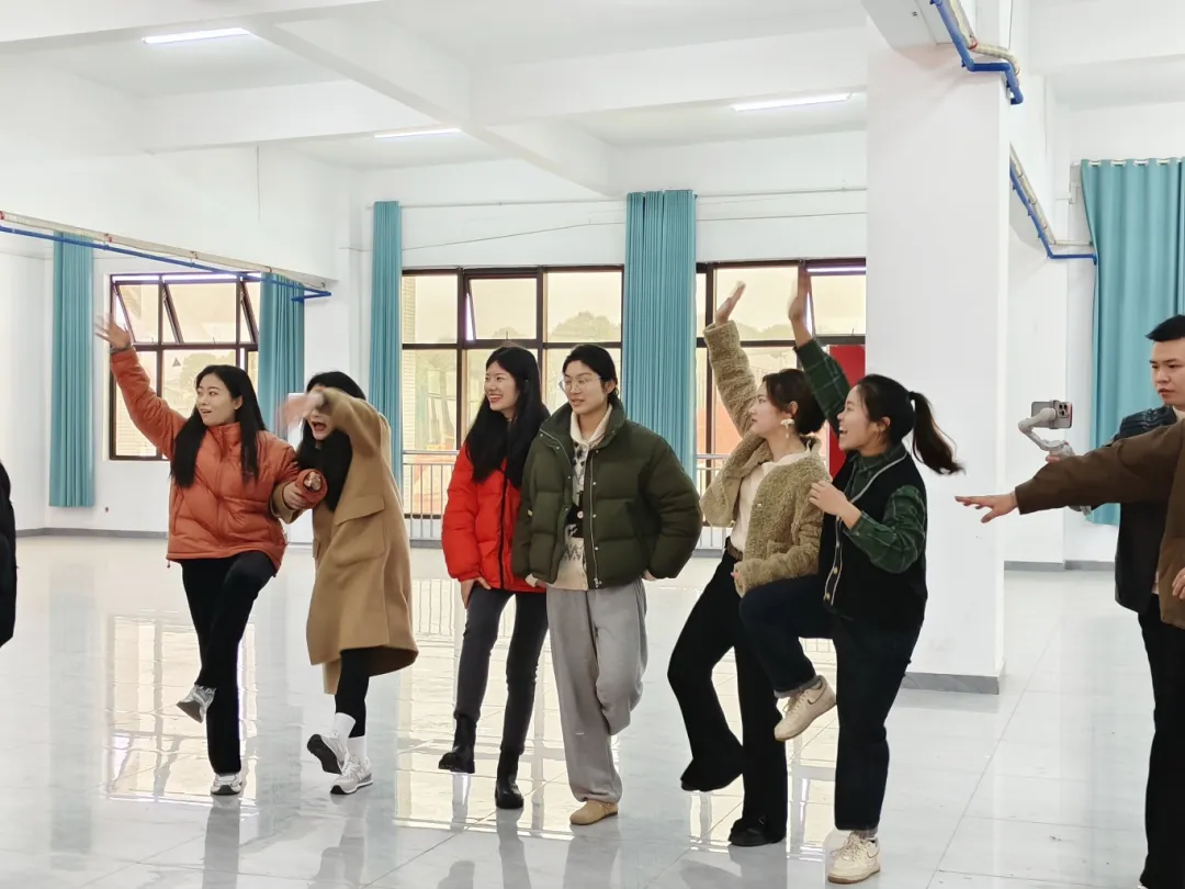 老师们按照裁判的要求组成不同的组合,然后听从指令——多少条腿着地。她们或抱或背,或蹲或趴,形态各异地展示着蜈蚣的各种姿态。现场气氛异常热烈,观众们的笑声此起彼伏。